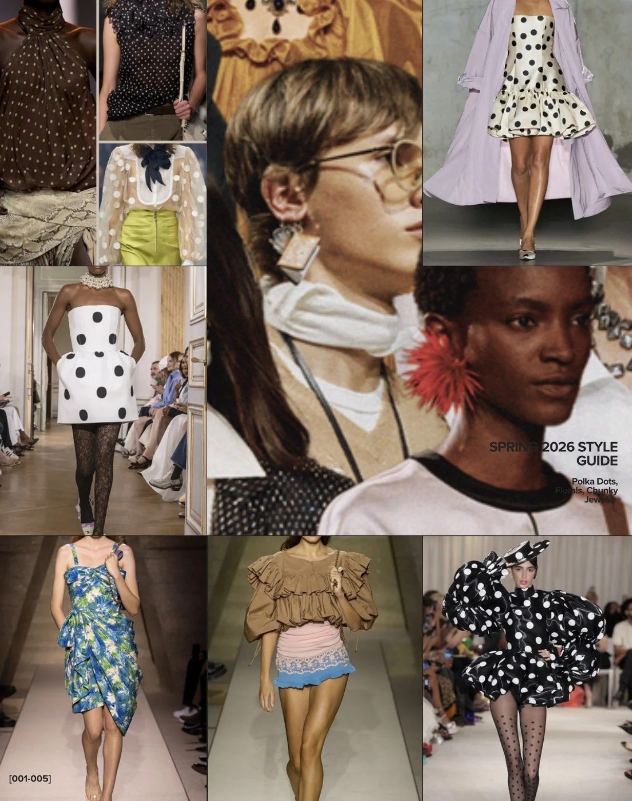 In Spring 2026, the "more-is-more" philosophy takes over through a high-energy mix of polka dots, painterly florals, and heavyweight jewelry. This season’s polka dots move away from retro kitsch, appearing instead in oversized, irregular scales on sheer fabrics and sharp tailoring to create a sophisticated, graphic impact. These are frequently layered with "electric" florals—vibrant, watercolor-inspired prints that feel more like modern art than traditional garden patterns. To anchor these busy motifs, jewelry trends have pivoted to sculptural maximalism; think chunky gold "door-knocker" earrings, thick molten-silver cuffs, and oversized bezel-set gemstone rings. The result is a bold, '80s-inspired Glamoratti look that celebrates clashing textures and fearless self-expression.